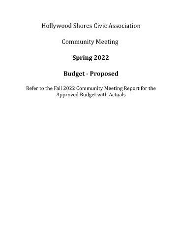 Hollywood Shores Civic Association Community Meeting Spring 2022 Budget - Proposed Refer to the Fall 2022 Community Meeting Report for the Approved Budget with Actuals