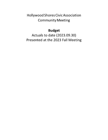 Hollywood Shores Civic Association Community Meeting Budget Actuals to date (2023.09.30) Presented at the 2023 Fall Meeting